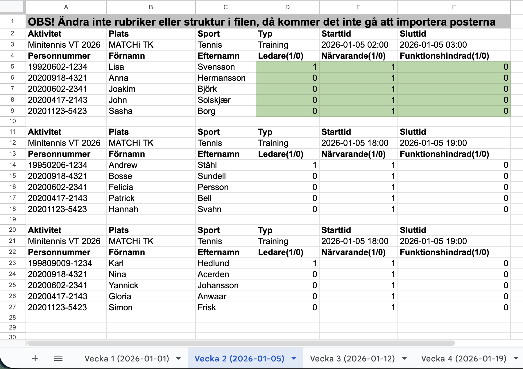 Die Datei ist größtenteils vorausgefüllt, mit den Namen und Personennummern deiner Leiter und Teilnehmer, die bereits von Anfang an enthalten sind. Du musst nur ihre An-/Abwesenheit ergänzen oder neue Teilnehmer hinzufügen, die während des Kurses dazugekommen sind.