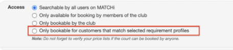 2. Go to Administration - Court management - Courts. Go to the court that you want to be booked only. Select Access - "Only bookable for customers that match selected requirement profiles" and then select the one you created in step 1 and press Save.