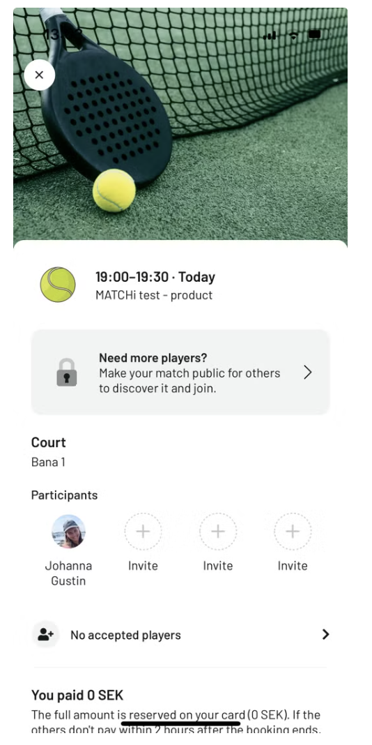 - You have the option to lock spots of a match by clicking the lock in the player component in the booking page. This is good to use if you have someone joining your match that is not a MATCHi user. Locked spots will not be open for other players to request to join.
