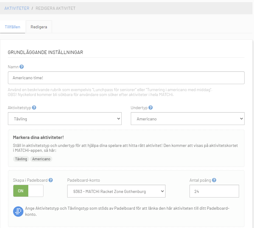 Gå först in på aktivitetsmallen (Administration --> Aktiviteter --> Välj aktivitetsmallen --> Redigera) och fyll i tävling samt vilken spelform det är. Aktivera ”Skapa i Padelboard” och se till att det är rätt konto kopplat. OBS! Detta aktiverar automatiskt kopplingen för tillfällen som skapas framöver, det påverkar inte redan skapade tillfällen. För att koppla redan skapade tillfällen, gå in på det specifika tillfället ni önskar använda Padelboard för och gör samma som ovan.