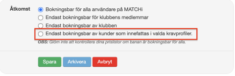 2. Gå till Administration - Hantering av Banor - Banor. Gå in på banan som ni önskar att det endast ska bokas på. Välj Åtkomst - "Endast bokningsbar av Kunder som innefattas i valda kravprofiler" och välj då den du skapade i steg 1 och tryck Spara