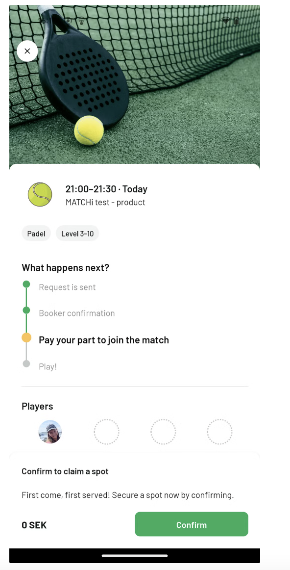 Om du saknar spelare till en match kan du nu göra bokningen offentlig så att andra spelare i MATCHi kan upptäcka den. Du sätter ett nivåintervall för matchen, och andra kan fråga om att få gå med genom att ange sin nivå. Som bokare har du full kontroll över vilka som accepteras eller nekas till din match. Detta hjälper dig att fylla dina matcher med spelare på samma nivå och förhoppningsvis kan du spela mer!